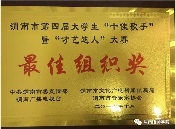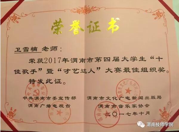 近日,由中共渭南市委宣傳部、市文化廣電新聞出版局等部門主辦的“中國夢·我的夢——青春飛揚(yáng) 放飛夢想”渭南市第四屆大學(xué)生“十佳歌手”暨“才藝達(dá)人”大賽已圓滿落幕。我院團(tuán)委在本屆大賽中組織得力,成績優(yōu)異,受到渭南市委宣傳部、市文化廣電新聞出版局等部門的表彰。院團(tuán)委衛(wèi)雪楠老師獲得大賽最佳組織獎(jiǎng)個(gè)人獎(jiǎng);院團(tuán)委獲得大賽最佳組織獎(jiǎng)。