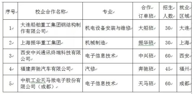 校企合作“訂單冠名班”專業(yè)設(shè)置情況