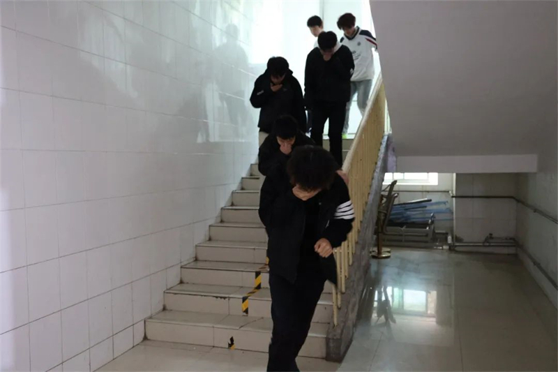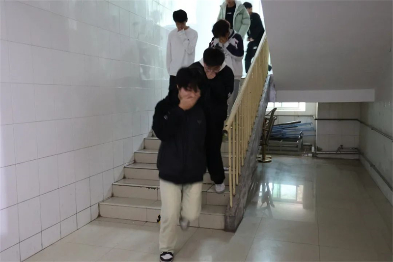 隨著警報(bào)聲響起,活動(dòng)正式開始。班主任和教官迅速反應(yīng),引導(dǎo)學(xué)生們捂住口鼻,低姿彎腰沿著疏散路線快速有序地向安全區(qū)域撤離。同學(xué)們?cè)谘菥毣顒?dòng)中不慌不亂,聽(tīng)從指揮,緊張有序,展現(xiàn)出了良好的組織紀(jì)律性和應(yīng)對(duì)緊急突發(fā)事件的能力。
