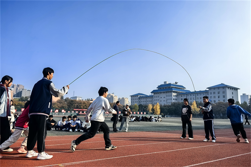 “跳長繩”賽項在裁判的一聲哨響后,運動員們像一群跳動的精靈,在長繩搖動的節(jié)奏中找到了默契,在晴朗的秋空下跳躍歡騰,如詩如畫,充滿活力,充滿希望。