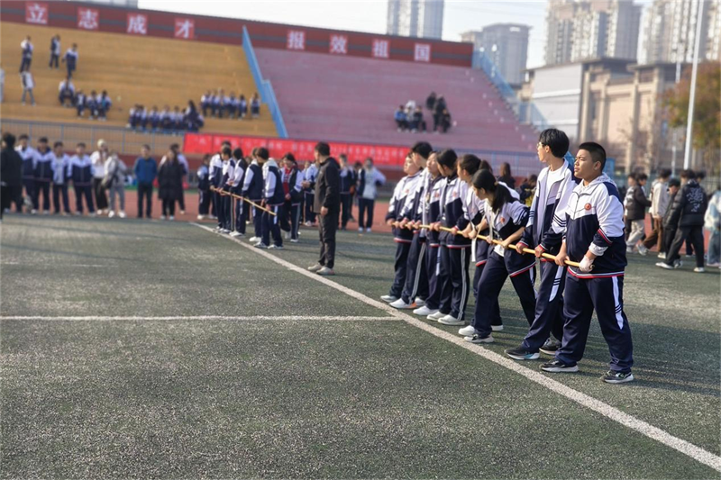 師生共同參與拔河比賽,此時的老師從講臺走到賽場,要么成為親臨一線指揮的“資深”教練,要么成為跟同學(xué)們并肩戰(zhàn)斗的親密隊友,比賽中雙方隊員竭盡全力,形成拉鋸狀態(tài),啦啦隊的吶喊聲此起彼伏,師生們?nèi)缤摭埑龊�,場面十分壯觀。